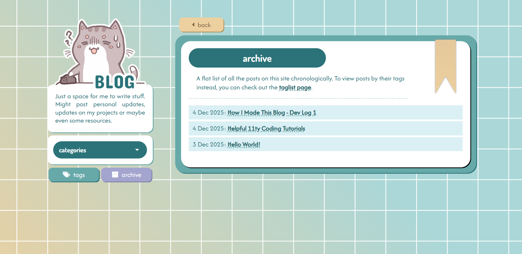 Similar to the tag list page, this page displays all the posts ever on this site. Really it's just a flattened version of the landing page, so it is created in basically the same manner, but only displaying the date and title of each post.