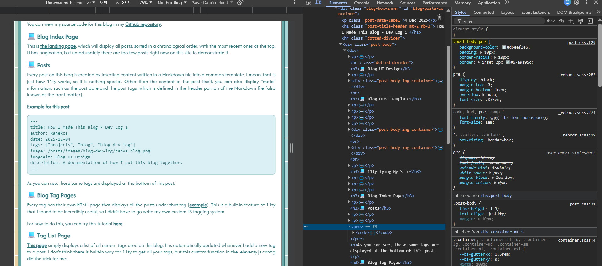 Every post on this blog is created by inserting content written in a Markdown file into a common template. I mean, that is just how 11ty works, so it is nothing special. Other than the content of the post itself, you can also display "meta" information, such as the post date and the post tags, which is defined in the header portion of the Markdown file (also known as the front matter).