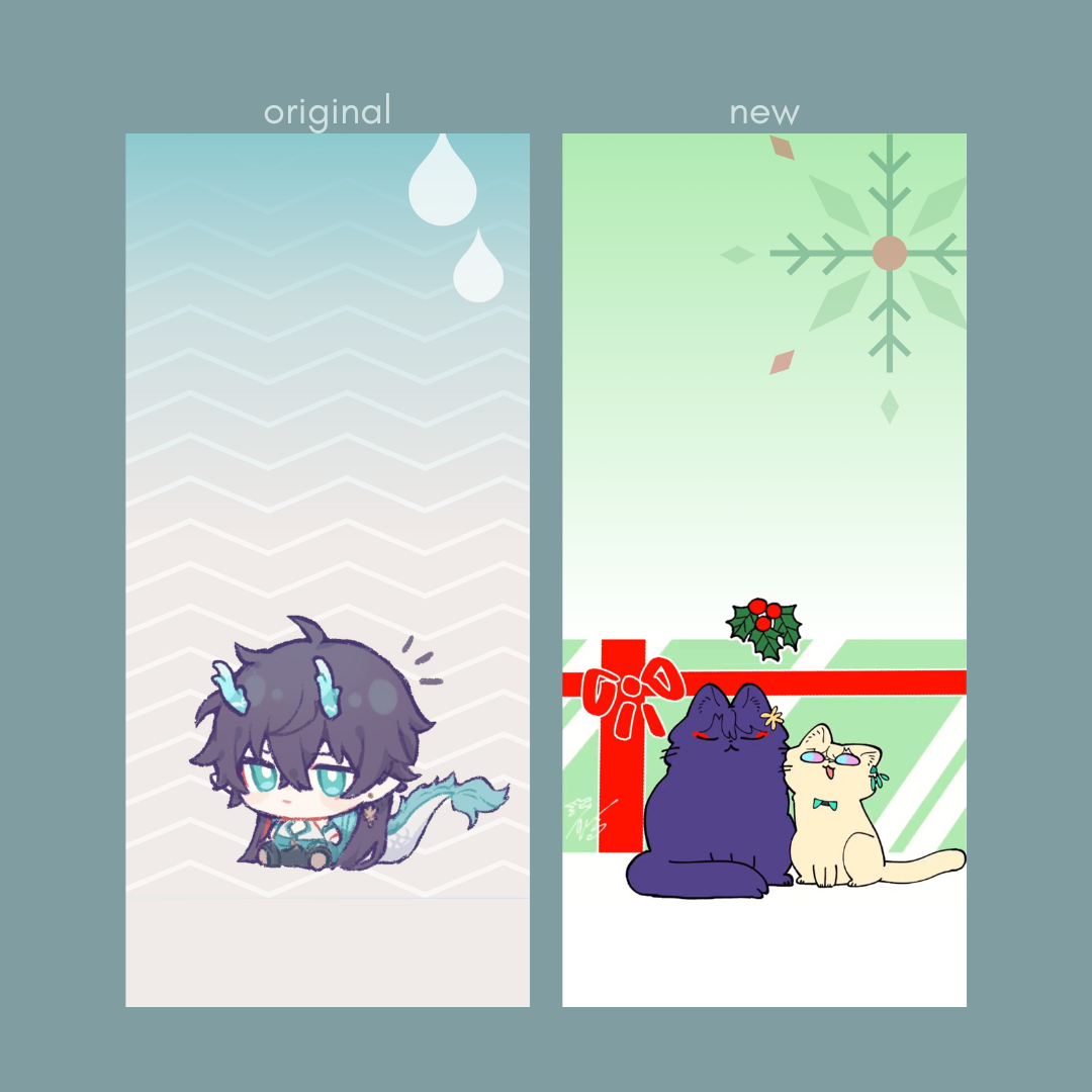 Next, we have my home screen wallpaper. The old one is an edit I made from this art of a chibi Dan Heng by mewki14 on Twitter. The new one is taken from this art by kaokitty1223 on Twitter, featuring kitty Dr Ratio and Aventurine.