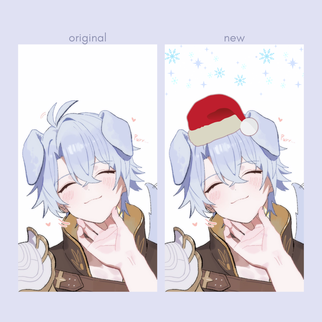 Let's start easy: Time for a new lockscreen and wallpaper for all of your devices. Maybe even something seasonal? Bonus challenge for tryhards & go-getters: (For PC users.) Ever tried to use custom folder icons for your folders? You can find some on deviantart for example. Personally I love these. It's a really neat way of sprucing up your files! Installation is easy: just right-click the folder and choose a new image for the icon.First up is my phone lock screen wallpaper. The source of the original art is HazoZOYAKU on Twitter, featuring Phainon from Honkai Star Rail, and I still really want to keep it as my lock screen, so I did a very silly festive edit of it on Canva.